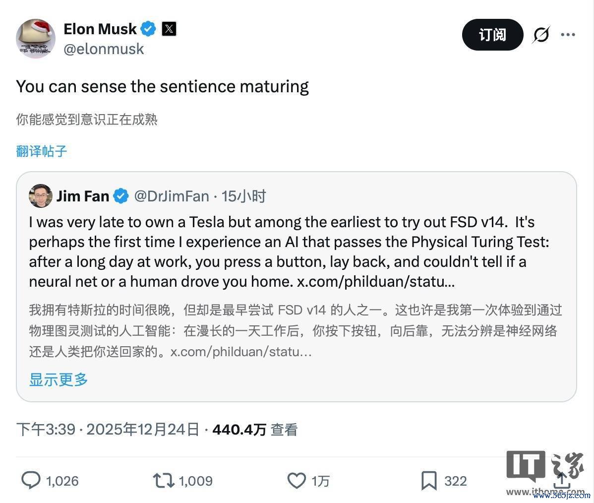 | IT之家 12 月 24 日音书,今天早晨,英伟达机器东说念主业务总监 Jim Fan 暗示,特斯拉的 FSD v14(IT之家注:受监管的版块)初次让 AI 通过了他提议的“物理图灵测试”。 Jim Fan 在体验 FSD v14 后指出,这套系谐和开动让东说念主惊奇,但很快就融入平日生计,遵循访佛智高东说念主机,一朝失去,反而会让东说念主感到光显不适。
